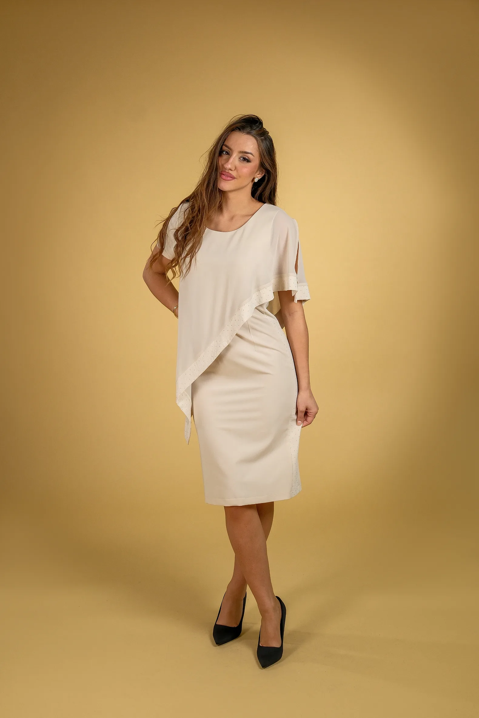 Haljina asimetričnog kroja koja koja prvi pogled privlači pažnju. Lagana i prijatna, izrađena od materijala koji pruža udobnost tokom celog dana, dok preklop u gornjem delu daje modelu posebnu dozu elegancije.