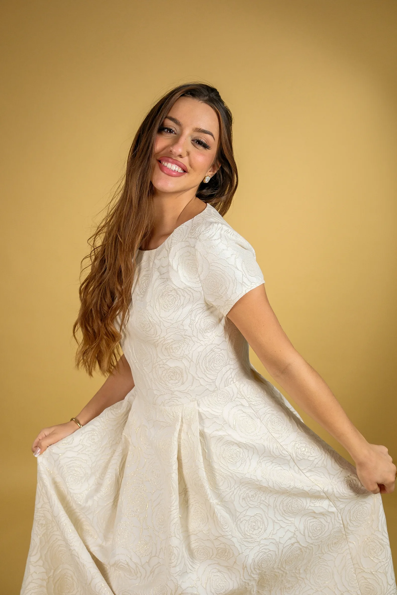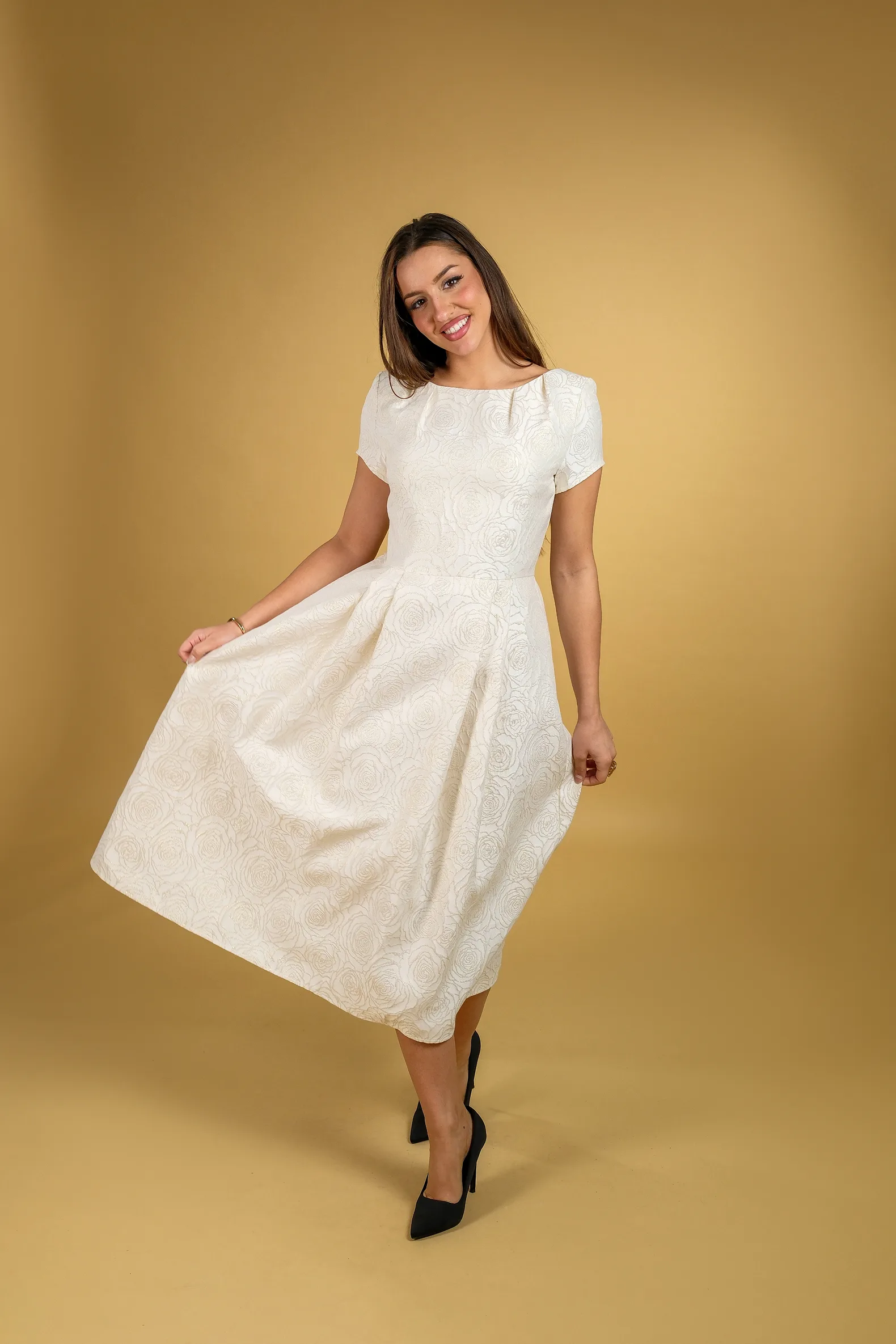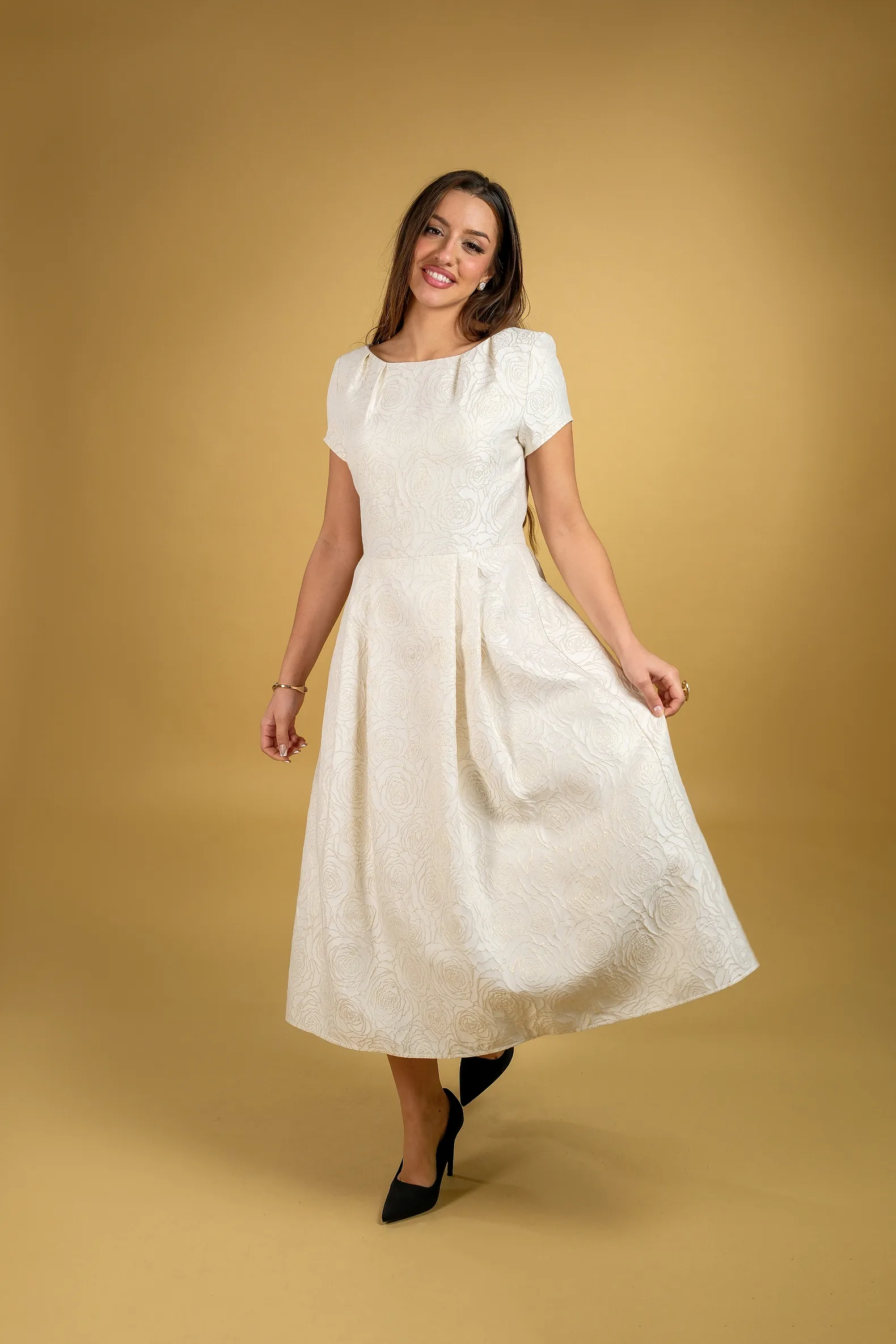 Haljina od brokata sa blagim sjajem koji materijalu daje raskošan i elegantan izgled. Širi kroj i dužina ispod kolena stvaraju prepoznatljivu “princeza” siluetu koja naglašava ženstvenost. Gornji deo sa kraćim rukavima doprinosi njenom klasičnom i sofisticiranom izgledu.