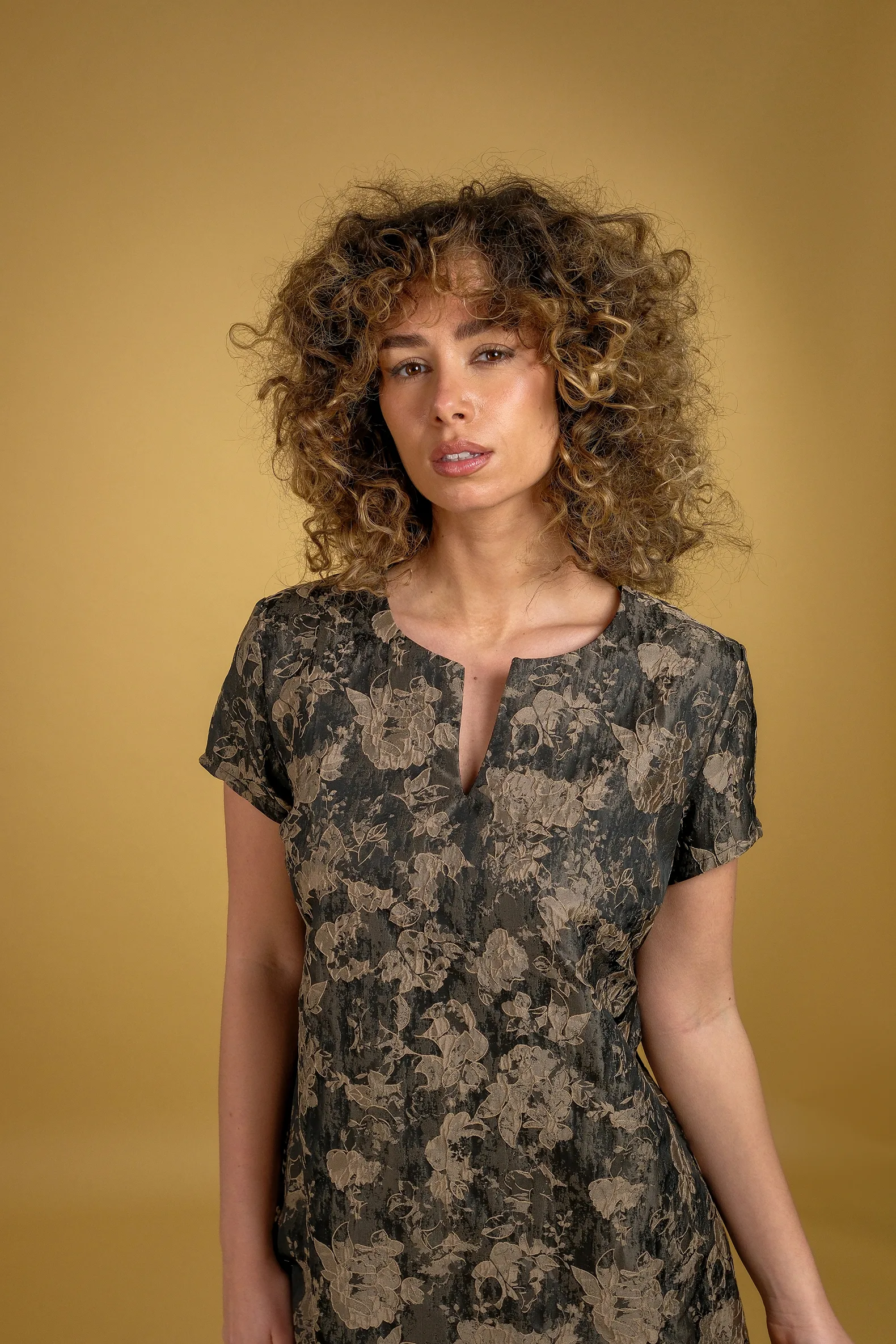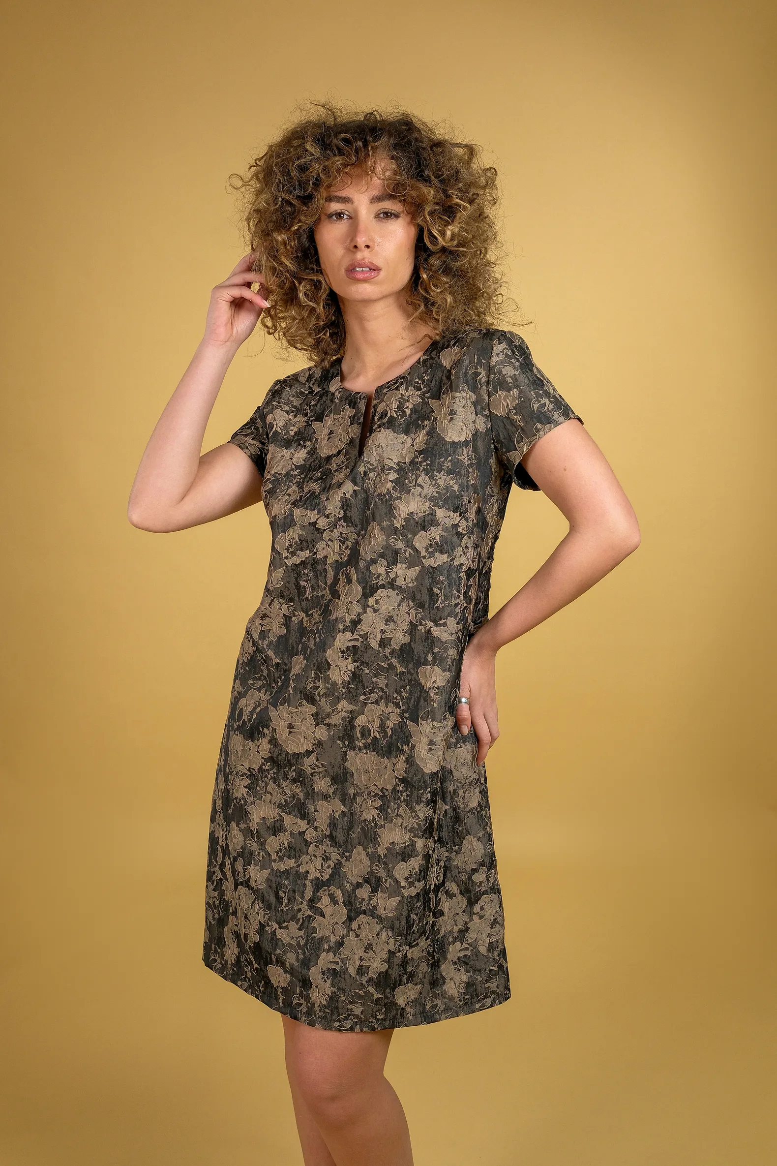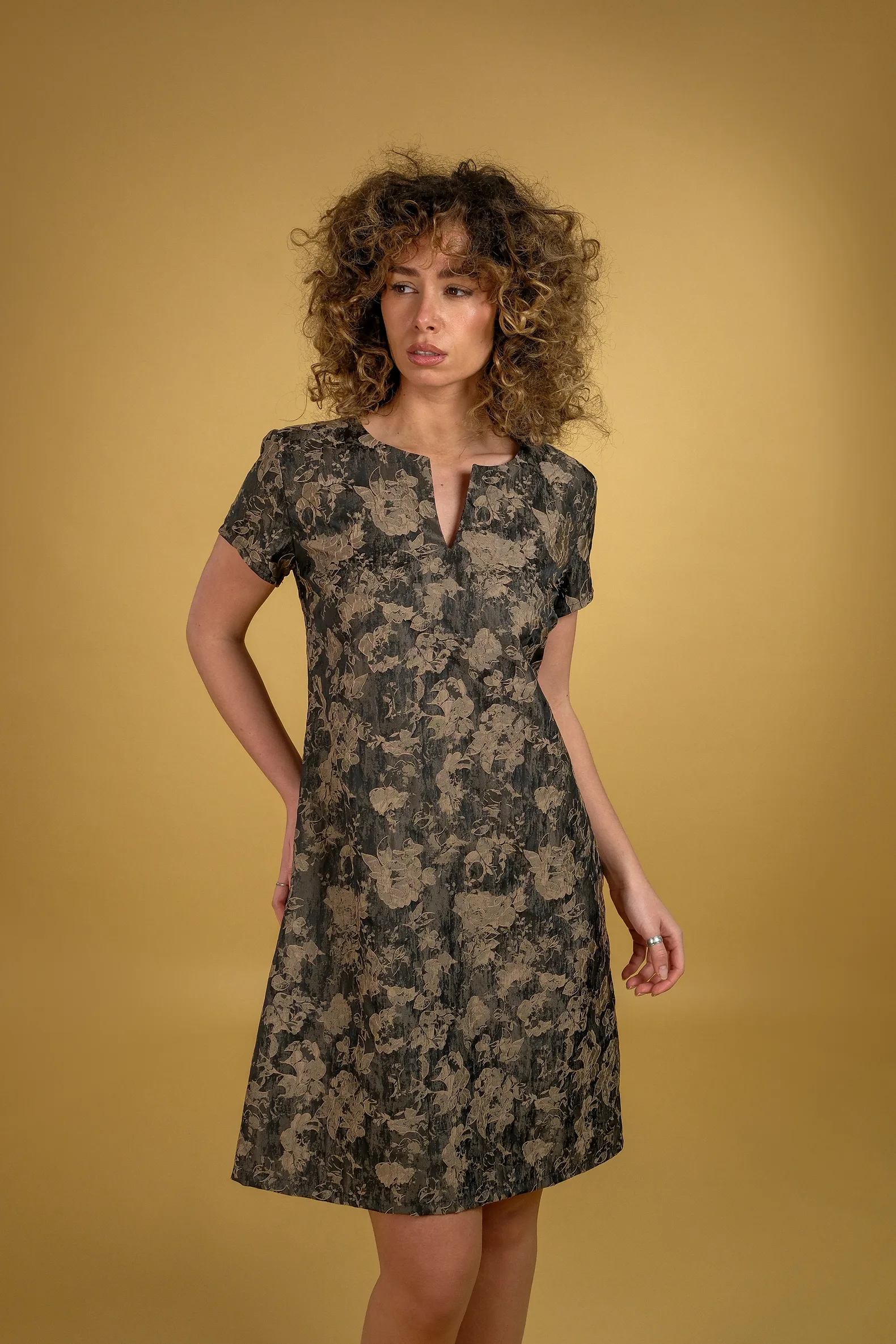 Haljina A kroja od brokata sa suptilnom teksturom koja daje elegantan i poseban izgled. Blago širenje pri dnu stvara lepu, ženstvenu siluetu i pruža lakoću pri nošenju, dok kratki rukavi i diskretan izrez doprinose njenom svedenom, sofisticiranom stilu.