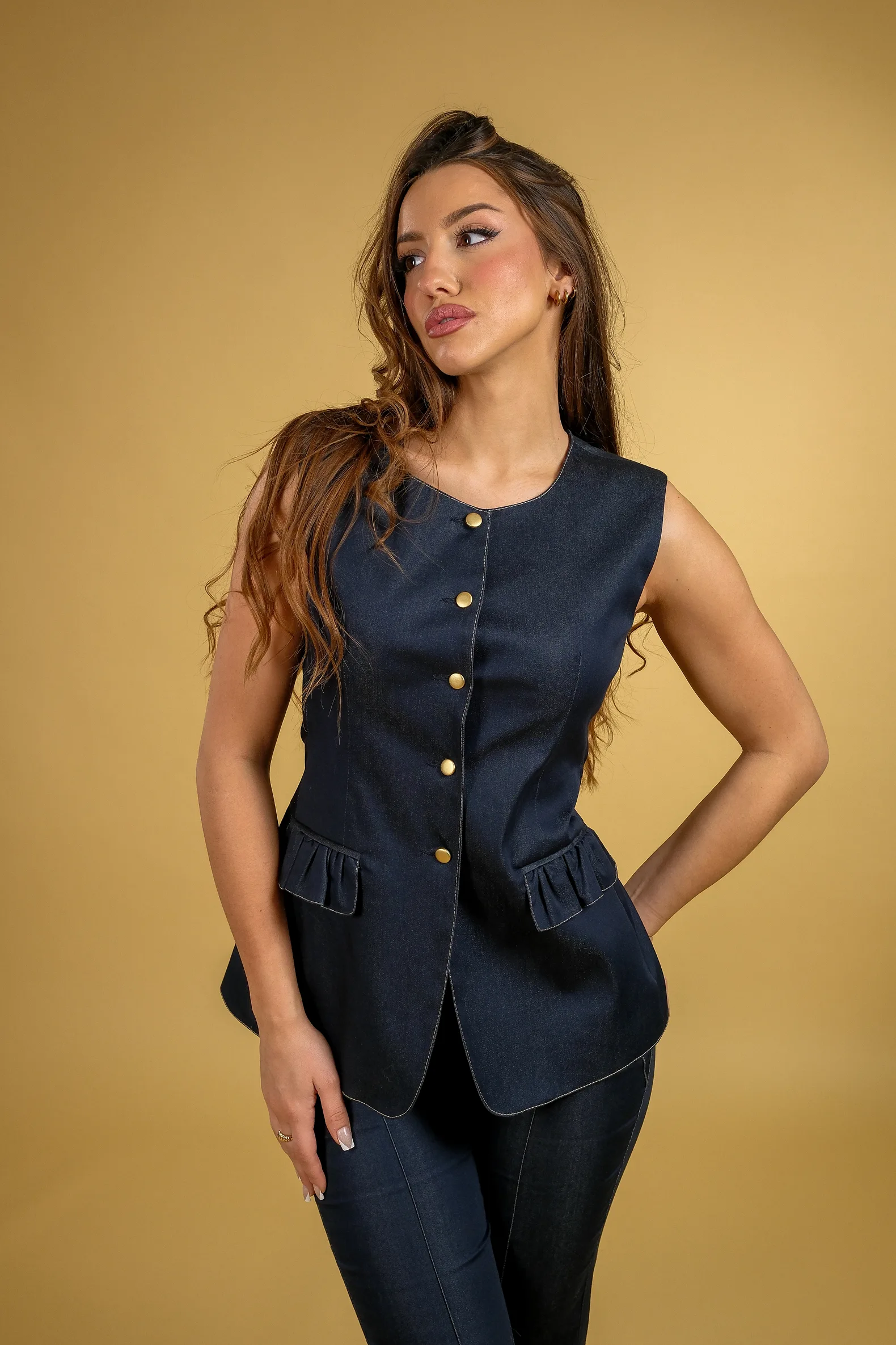 Prsluk u istoj nijansi kao sako i pantalone, osmišljen kao sofisticiran deo seta koji zaokružuje celokupan izgled. Strukirani kroj naglašava siluetu, dok vezivanje na leđima omogućava prilagođavanje širine i dodatnu definiciju struka.