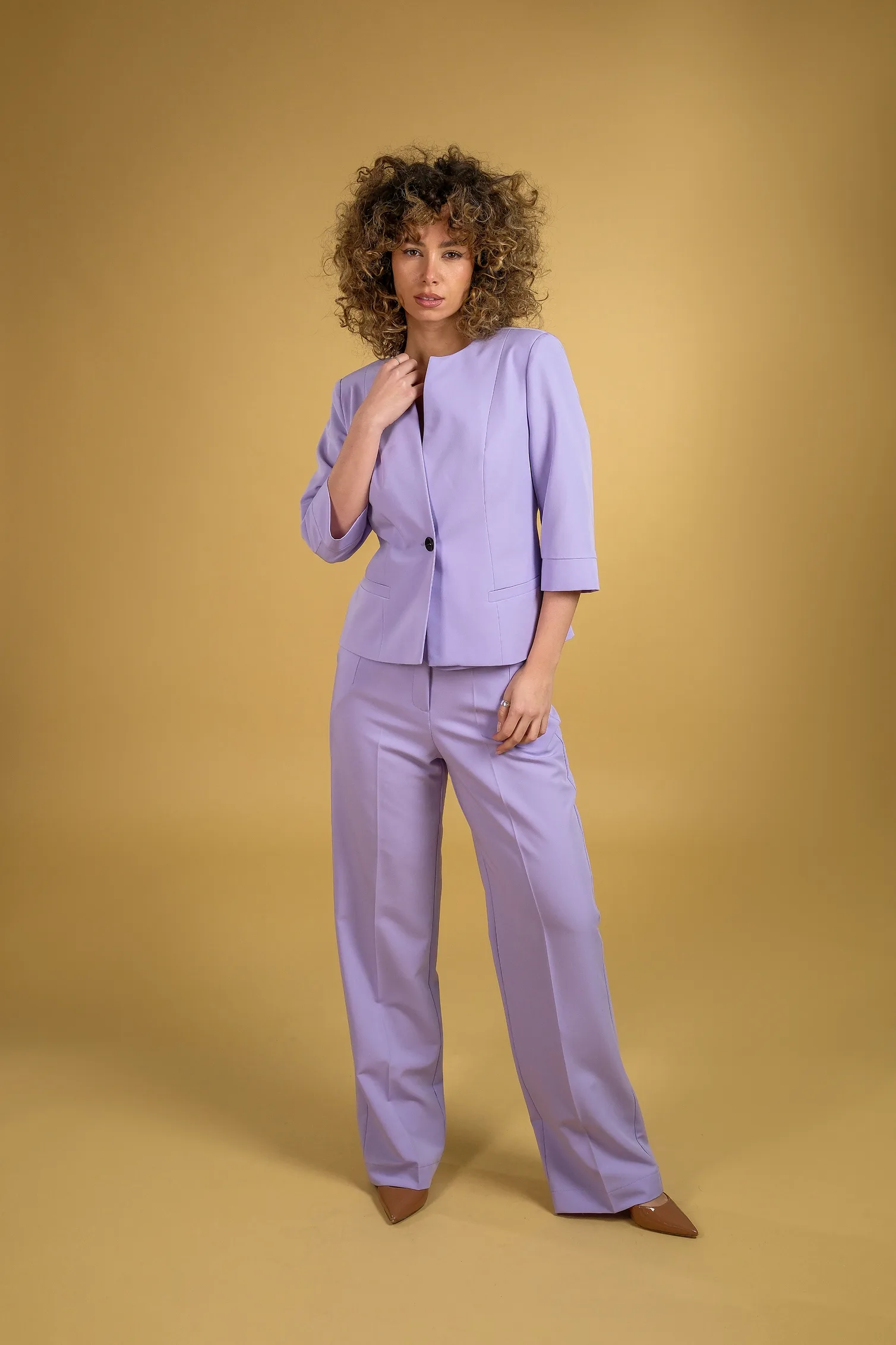 Kraći model sa jednostavnim kopčanjem na dugme i formom koja prati liniju tela. Diskretan dizajn bez klasičnih revera daje mu savremenu notu i lakoću u kombinovanju.