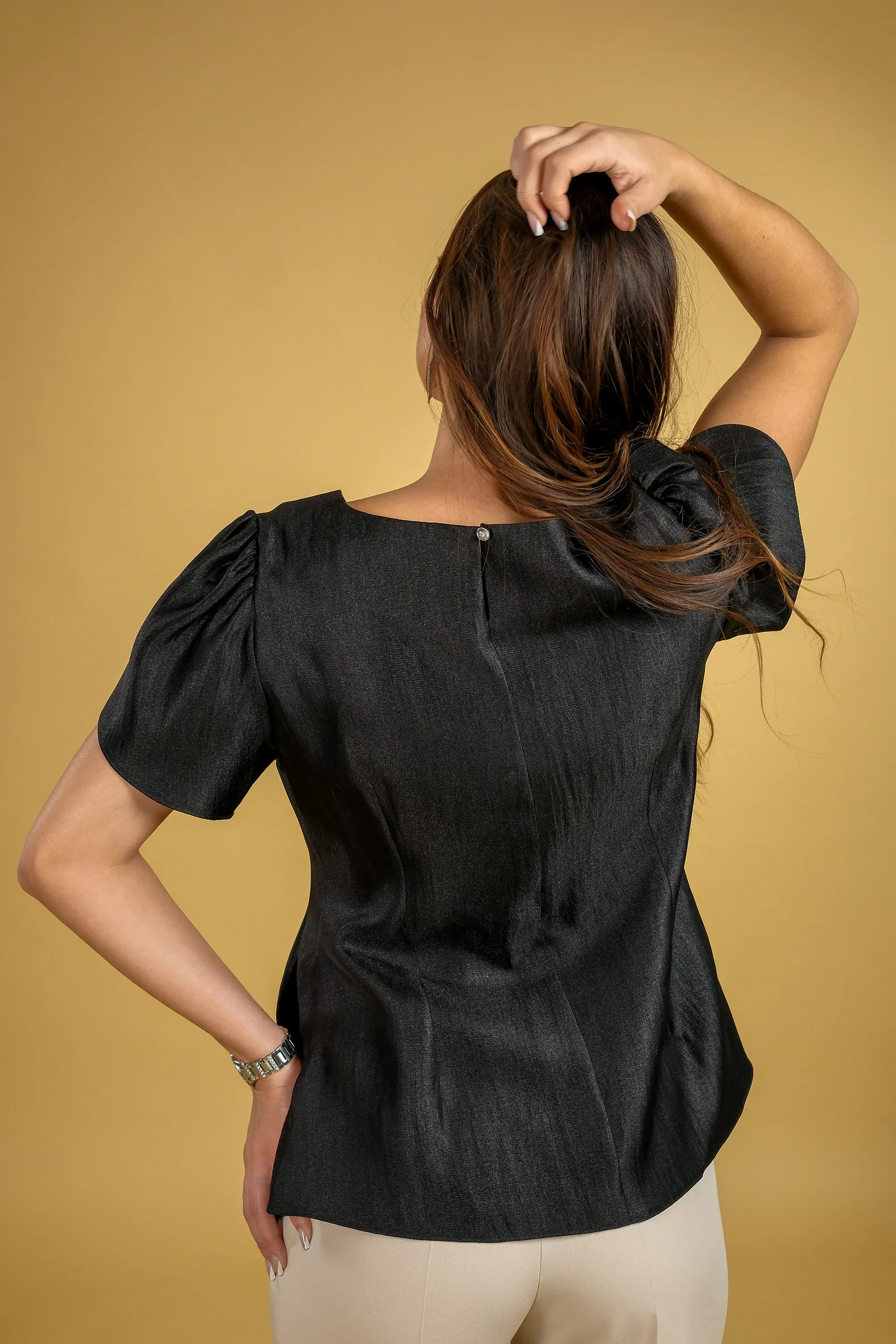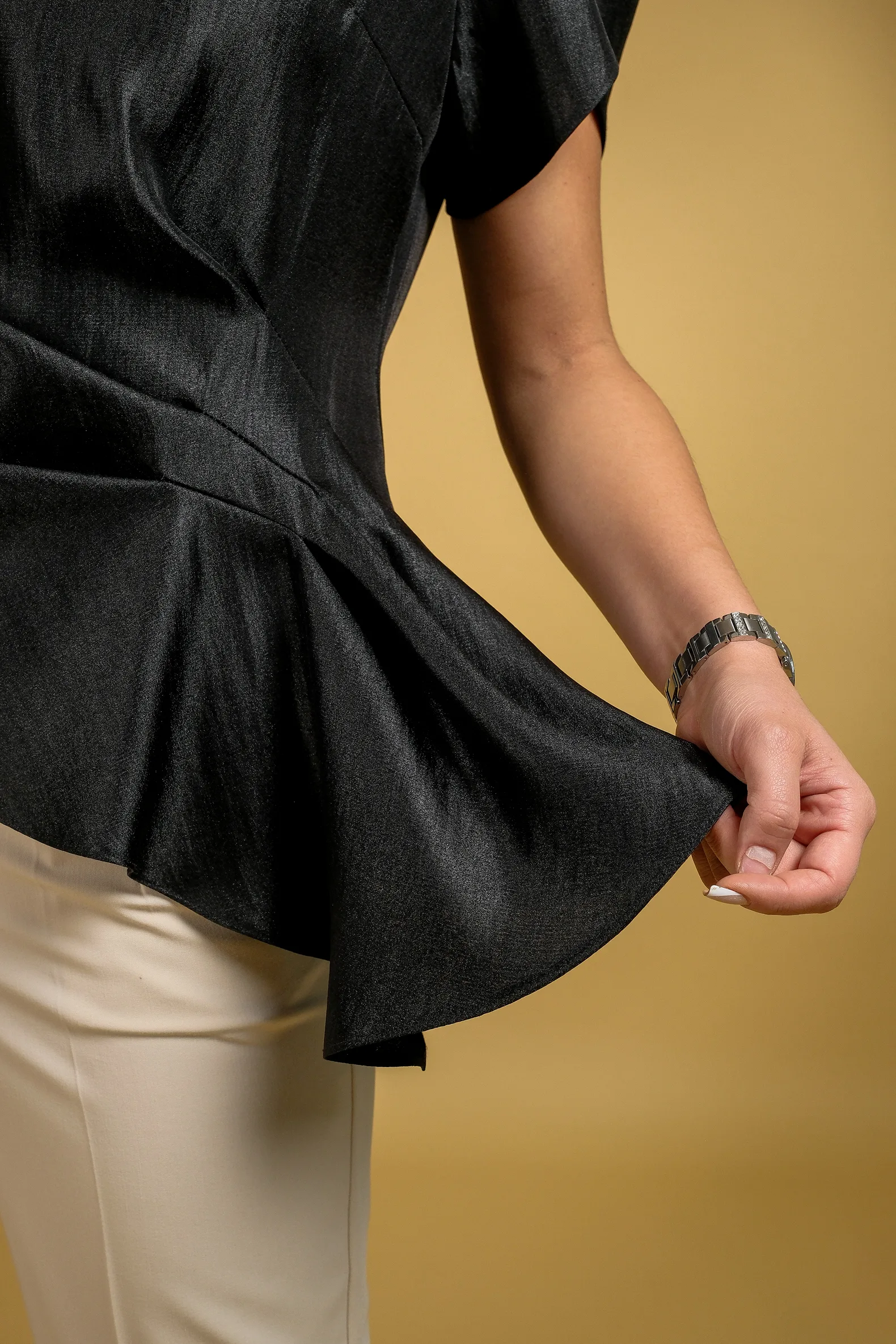 Tunika upečatljivog asimetričnog kroja koja na suptilan način privlači pažnju. Poseban akcenat daju asimetričan kroj i slojevito oblikovani rukavi koji unose dozu elegancije i izdvajaju ovaj model. Materijal lepo pada i pruža prijatan osećaj tokom nošenja, dok celokupan dizajn ostavlja utisak nenametljive sofisticiranosti. Dostupna u tri boje, za izbor koji se lako uklapa u različite stilove.